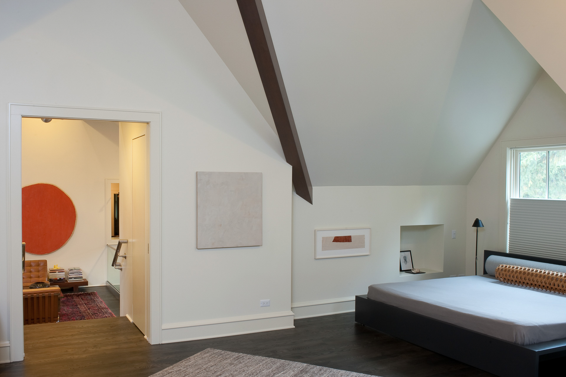 With a strongly contemporary sensibility and a respect for the historical significance of their home our client approached our firm with a need for an expanded floor plan accommodating an eat-in kitchen, attached garage, and a master bedroom suite. The addition to this load-bearing masonry Arts and Crafts residence set at the rear of the home utilizes the kitchen as a space for living and for entertaining. Perched above the kitchen connecting the first floor to the second floor master suite is a loft space that acts as both a sitting room for the bedroom and as a platform for the display of the client’s large collection of contemporary art.